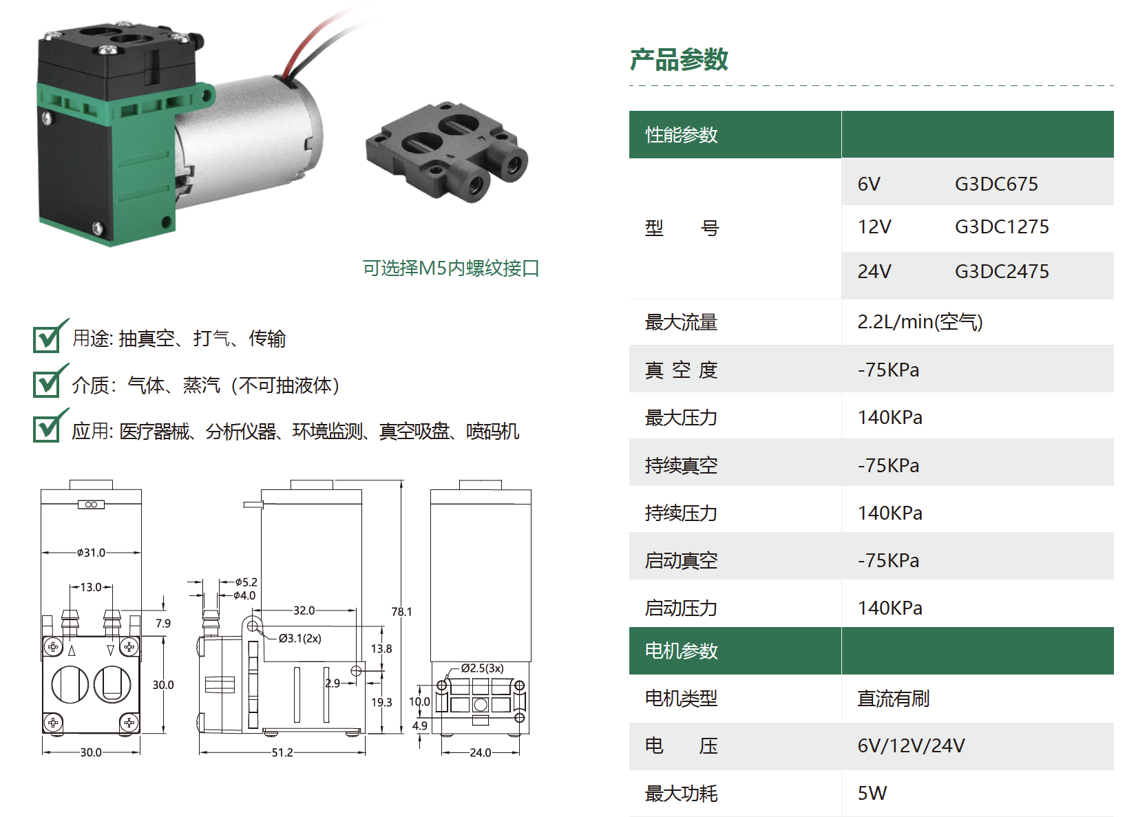 G3B 2.2L/min 微型无刷直流隔膜气体采样泵-75kpa高负压真